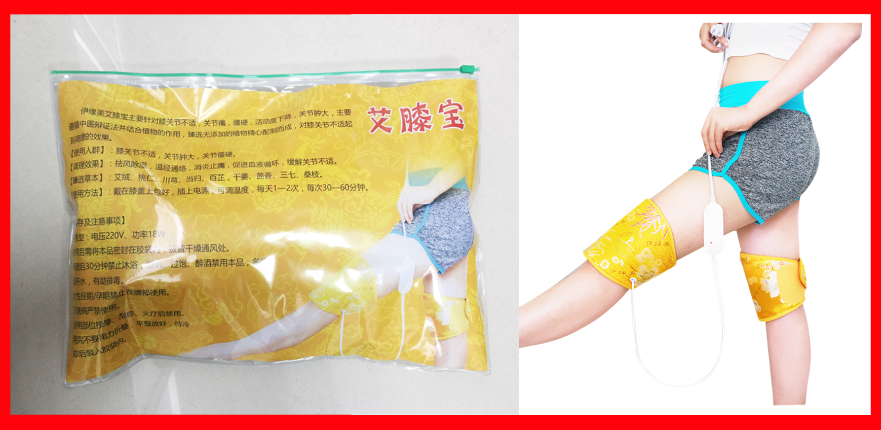 【使用(yòng)方法】:戴在膝蓋上(shà∏♠≠ng)包好(hǎo),插上(shàng)電(diàn)源,可(kě)調溫度,每天1—2次₽≤,每次30—60分(fēn)鐘(zhōng)。